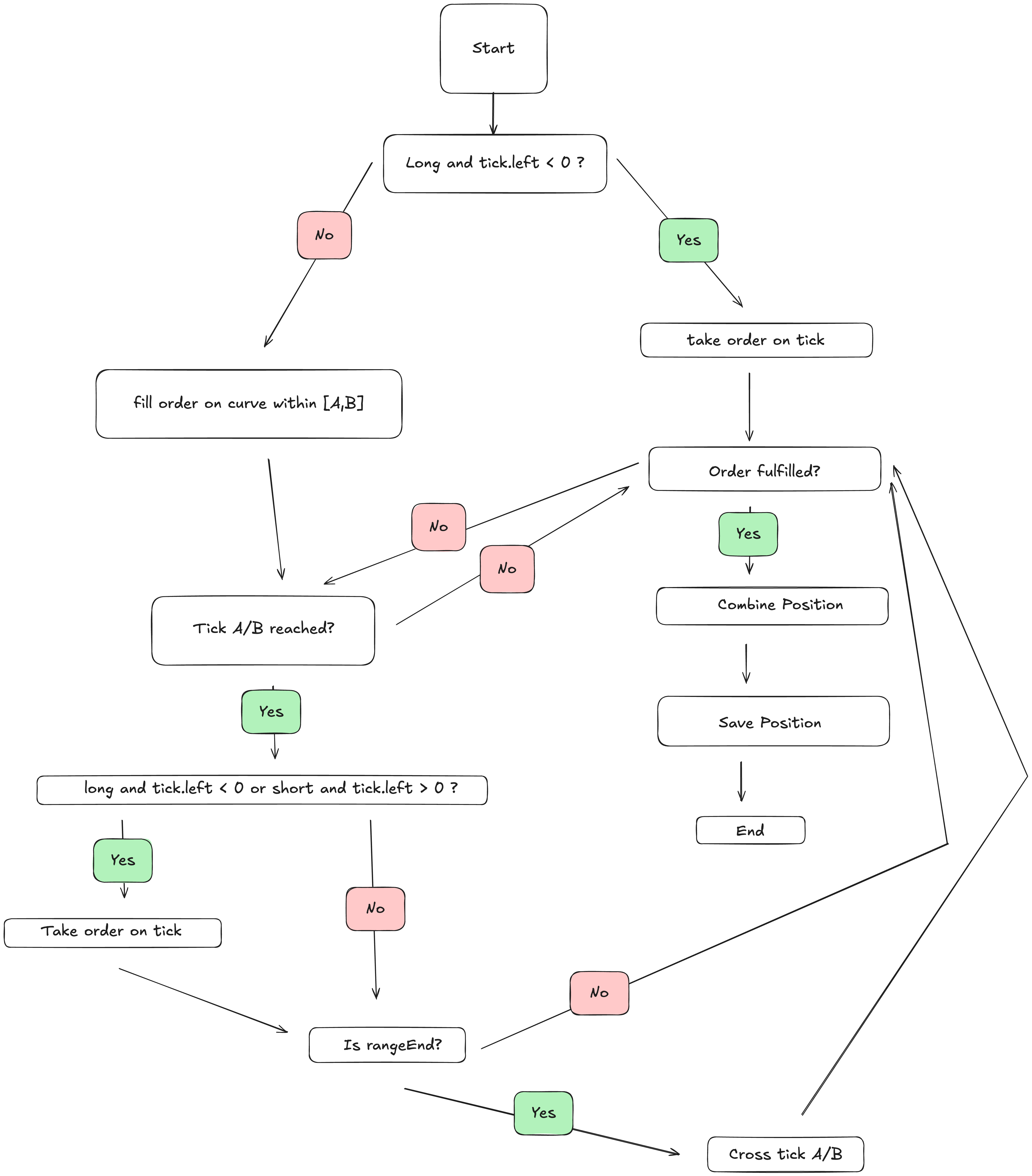 This sequential logic ensures that **maker orders are prioritized**, **execution remains atomic**, and **pricing evolves continuously** across ticks, resulting in a predictable and gas-efficient trading process.